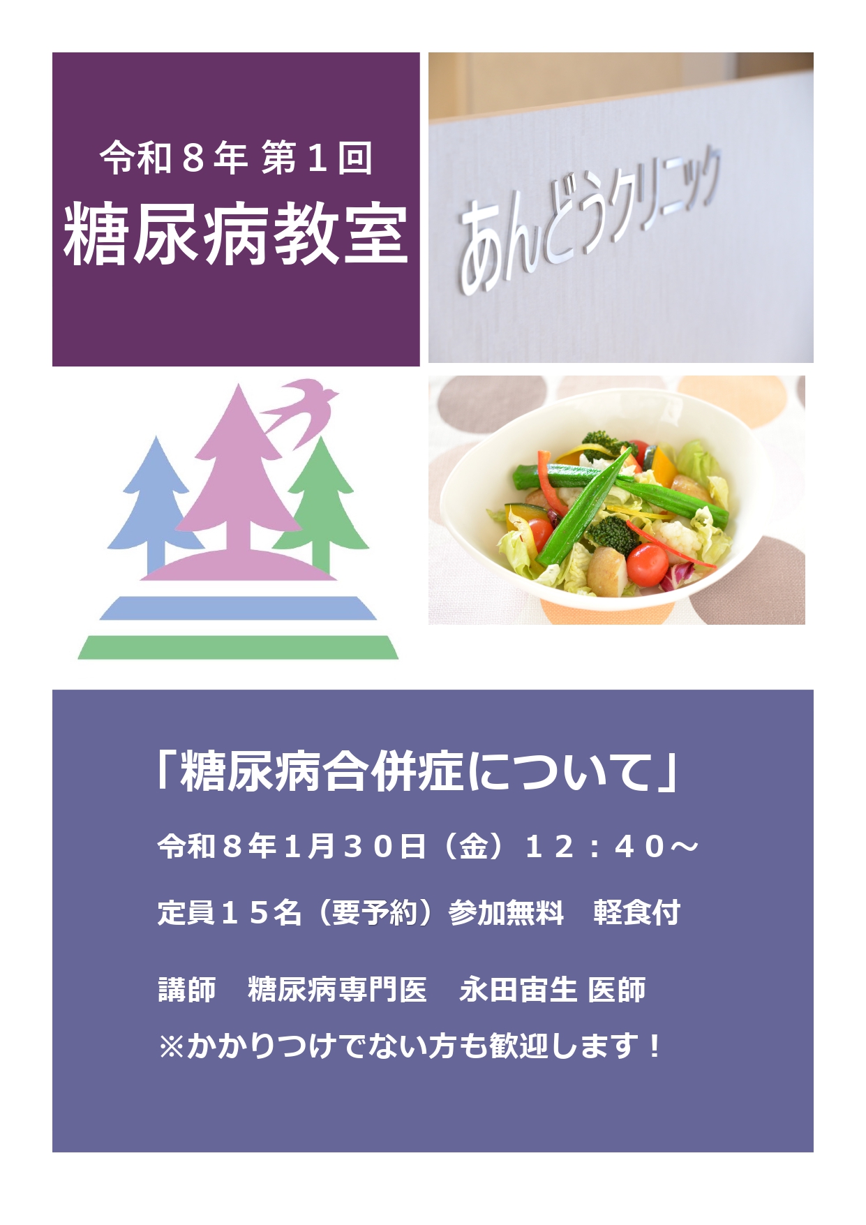 【好評!】令和8年度 第1回 糖尿病教室について 2026/01/16 いつもあんどうクリニックにご来院頂きましてありがとうございます。令和8年度 第1回 糖尿病教室を開催いたします!詳細は下記をご確認ください。参加無料(軽食付)、要予約です!予約の際は直接クリニックまでご連絡ください。ぜひこの機会にご参加ください。